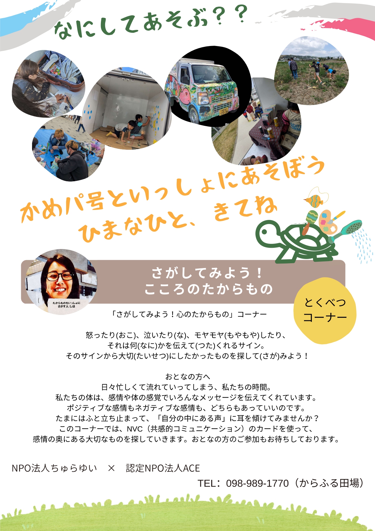 ACEが沖縄青少年自立援助センターちゅらゆいと行う「沖縄うまんちゅ子どもの権利推進プロジェクト」の活動の1つとして、2023年5月20日(土)に沖縄県うるま市の田場公民館でプレーパークを実施します。 自由に遊べるプログラムの他、「さがしてみよう!こころのたからもの」と題したコーナーではNVC(Nonviolent Communication=共感的コミュニケーション)を活用して感情や「自分の中にある声」に耳を傾けるワークも実施します。 ぜひご家族やお友達と一緒にお越しください。 イベント概要